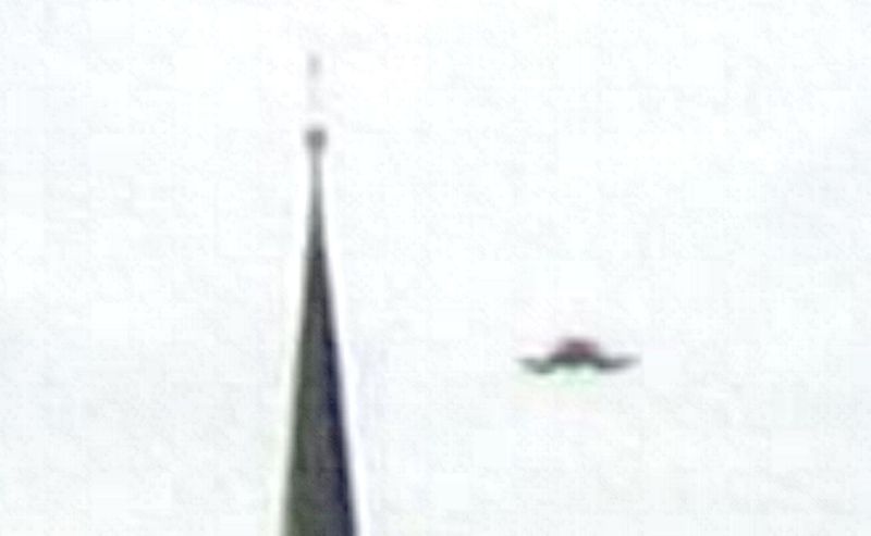 Ein Mann fotografiert den Baum, und in seiner Nähe fliegt ein "Ufo".